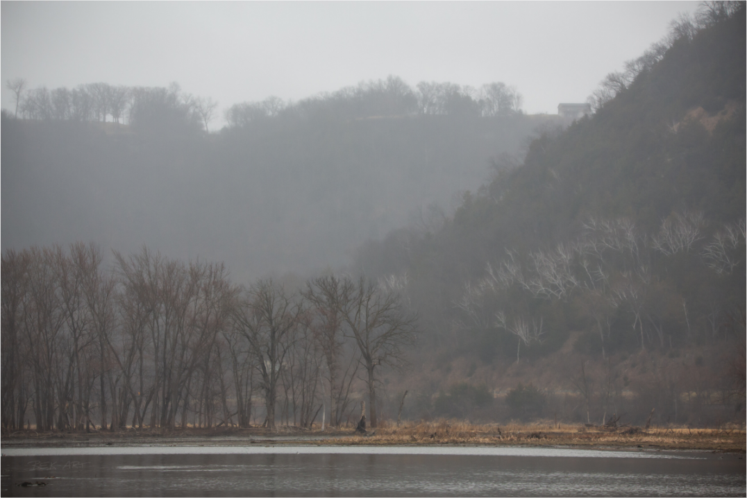 Hazy landscape of the river and bluffs.